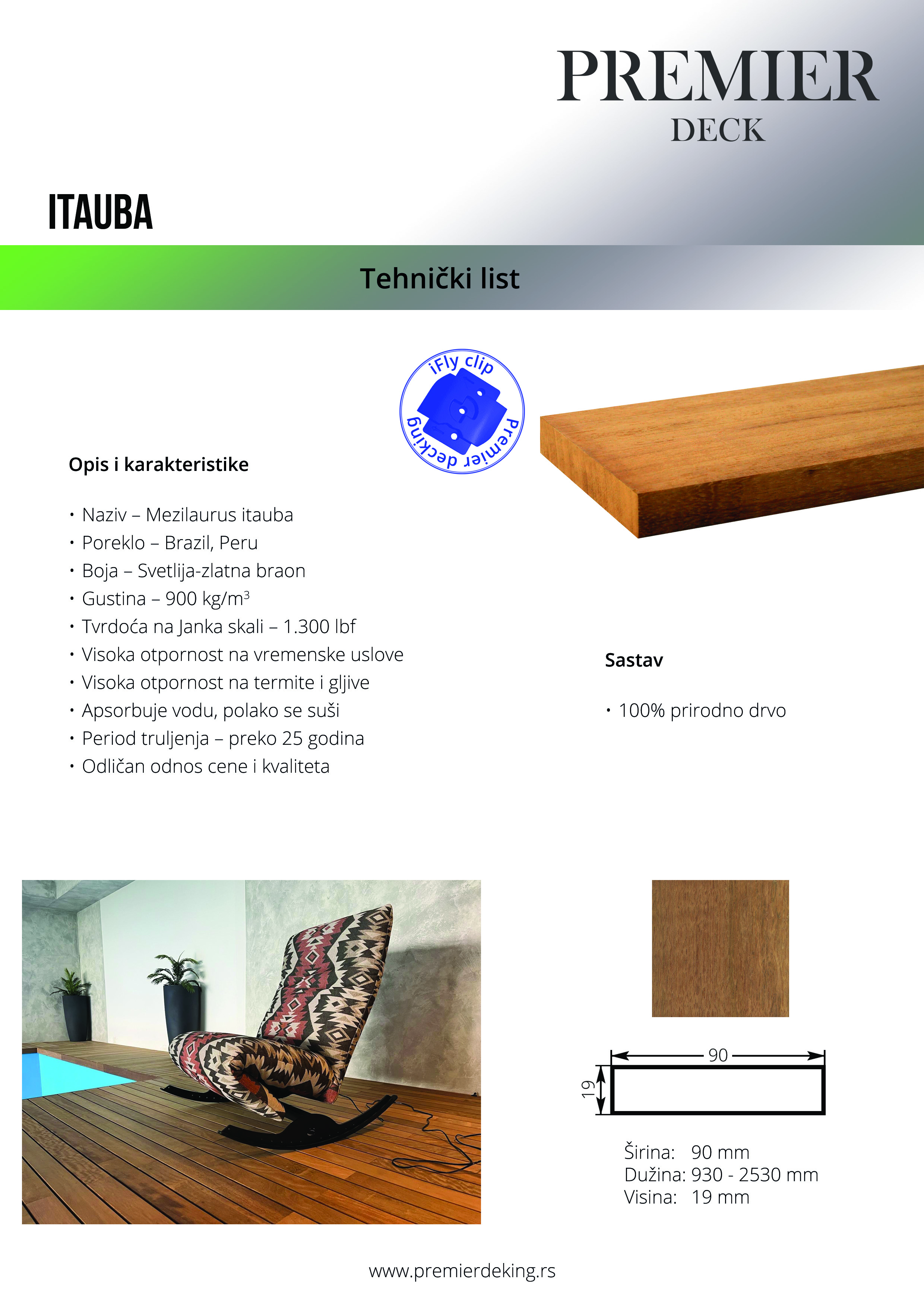 Itauba, drvo vrhunskog kvaliteta, poreklom iz prašuma Brazila. Odlikuje se velikom otpornošću na insekte i truljenje. Sa svojim karakteristikama se nudi kao odlična alternativa Teak-u i Ipe-u.